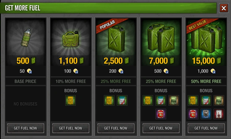 El combustible es uno de los muchos recursos que se pueden encontrar entre las ruinas de Union City, y es quizá el recurso más importante del juego, pues con este se pueden comprar los demás recursos, ademas de comprar armas, protección contra ataques de otros jugadores , ademas de que con el combustible de puede adelantar el tiempo de retorno de una misión, hay varias formas de obtener el combustible en el juego las cuales son: buscarlo en las diversa Zonas del Mapa, al limpiar el área del refugio, construyendo un generador de combustible, completando alguna misión, abriendo los diversos cofres del HERC, o comprándolo con cargo a una tarjeta de crédito.